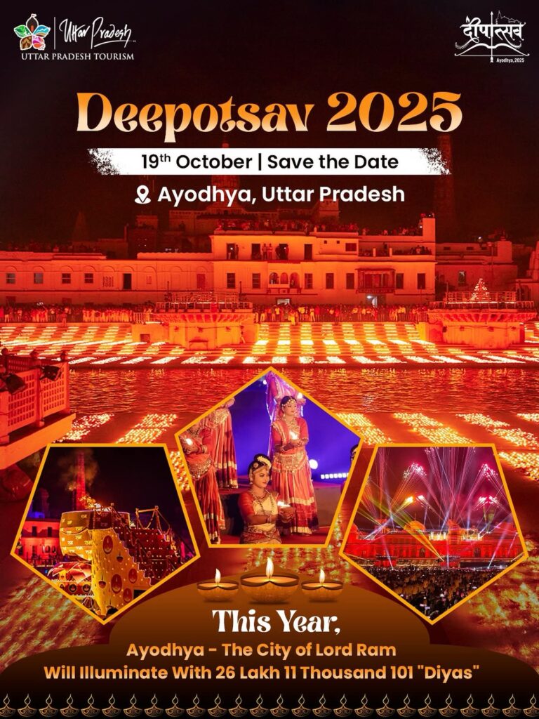 Deepotsav, the Festival of Lights in the sacred city of Ayodhya, is one of India’s most grand and spiritually vibrant celebrations. In 2025, Deepotsav’s main celebration day falls on 19th October 2025, with festivities running from 18th October to 22rd October 2025. This week-long festival transforms Ayodhya into a spectacular realm of light and devotion that commemorates the return of Lord Ram to his kingdom after 14 years of exile.