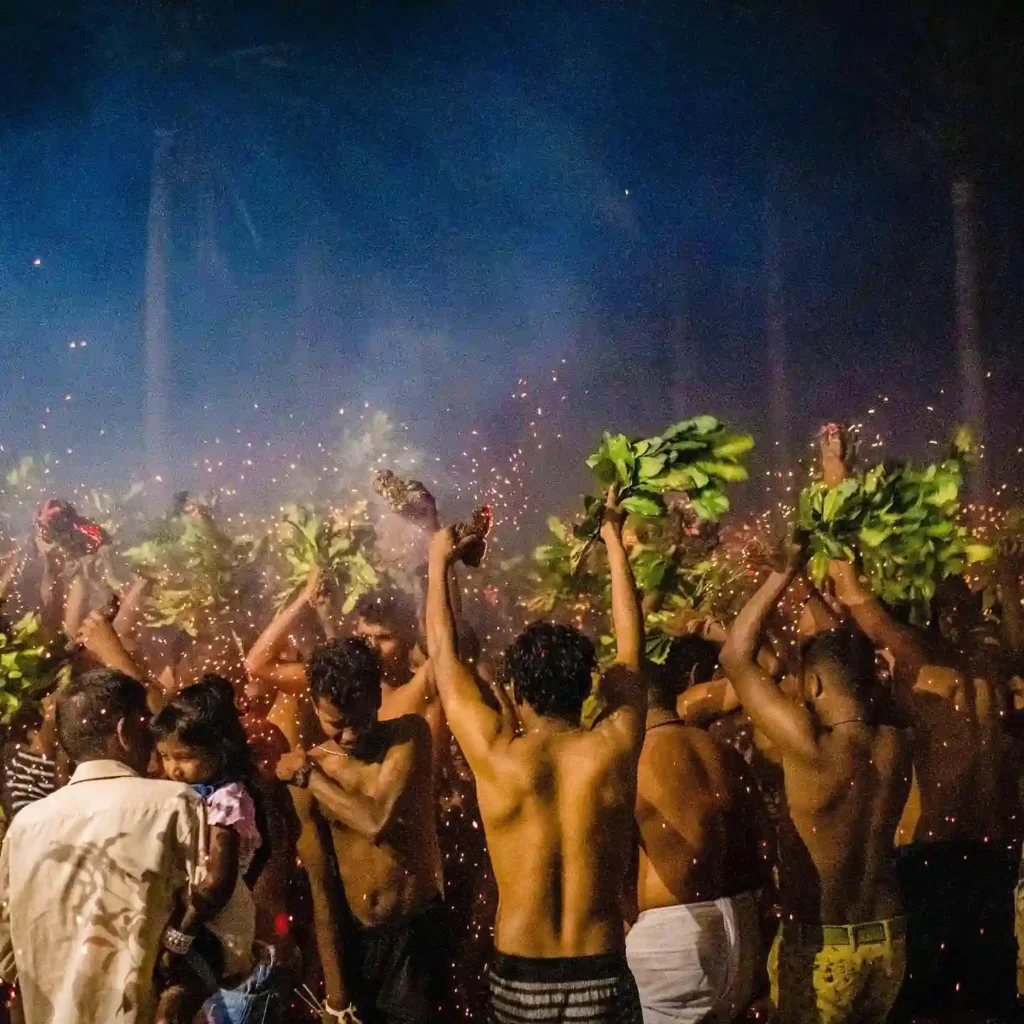 - The Visual: Imagine a pitch-black night illuminated only by thousands of sparks. Villagers dance while striking burning cow dung cakes (Xenni) against each other, creating massive showers of natural “fireworks” (Uzzo).